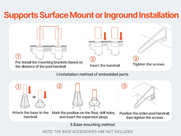 Dual Installation Options: Supports recessed or base mount installation. Choose the best method for your pool setup. Note: Base mount accessories are not included; only the pool rail is supplied