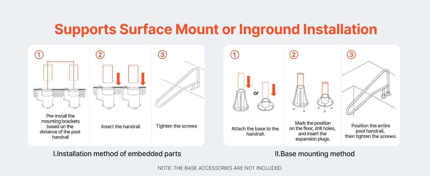 Versatile Placement: Can be installed on concrete, wood, or brick surfaces. Ideal for swimming pool rails at pools, sloped-entry pools, spa centers, and water parks. Ideal for assisting seniors, and disabled people to enter and exit the pool
