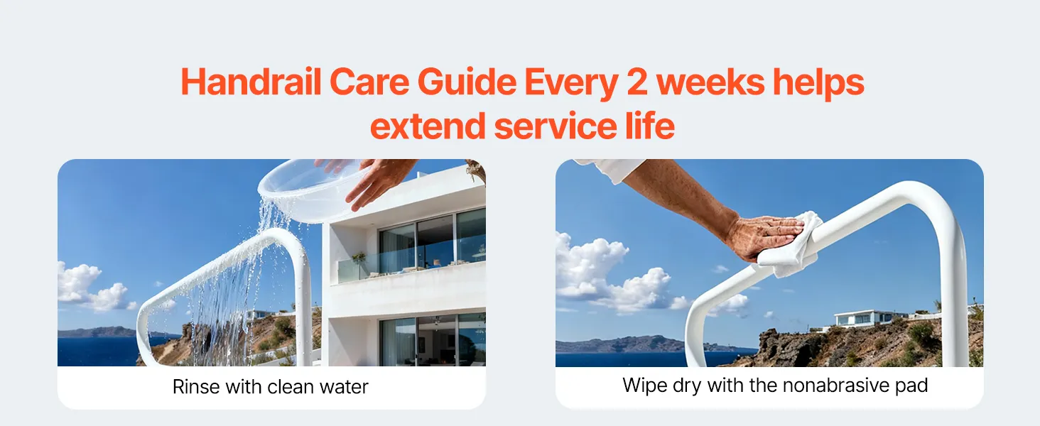 The pool handrail has a stainless steel core with polymer coating for durability and corrosion-resistance in salt or chlorine pools. Includes protective sleeve and cleaning cloth for easy maintenance and longer lifespan.