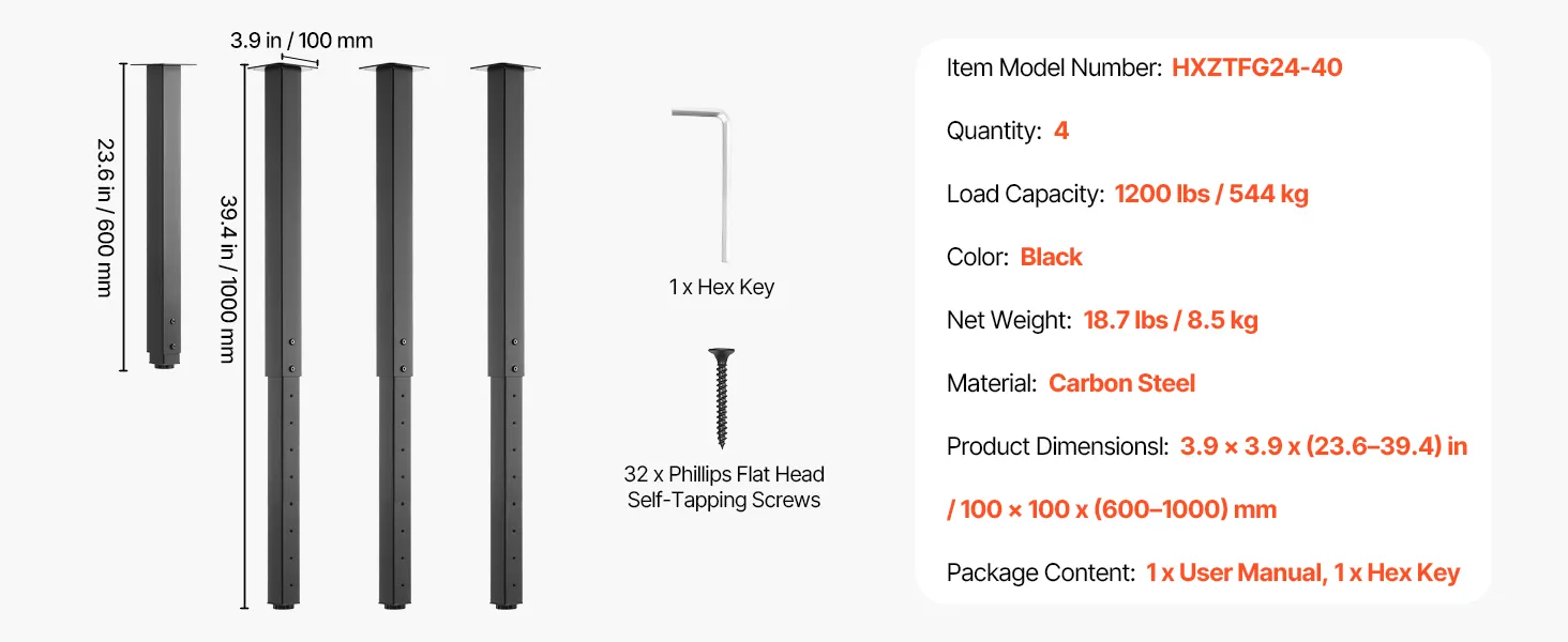 Adjustable Height: Each table leg adjusts by installs through preset screw holes from 24-40 in / 610-1016 mm, making these metal table legs suitable for DIY coffee tables, side tables, desks, dining tables, and workbenches