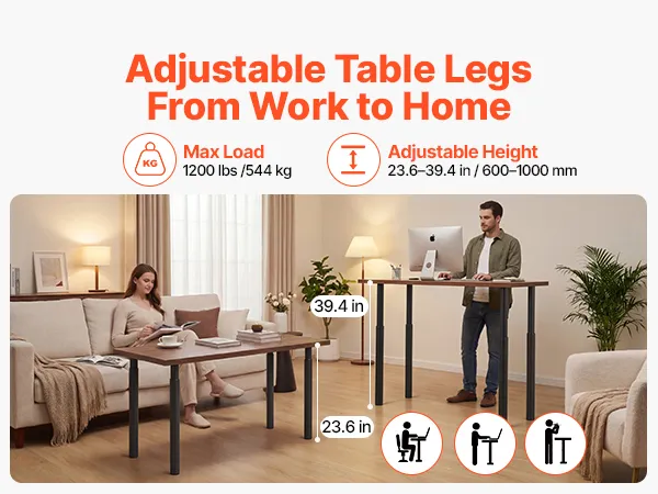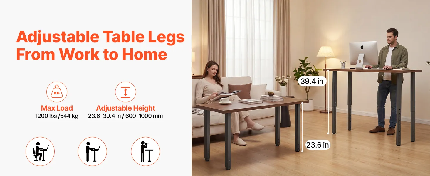 VEVOR Adjustable Table Legs, 610-1016 mm Square Steel Furniture Legs, 544 kg Max Load Heavy Duty, Quick Installation, for Home Office Desk DIY, Coffee Dinner Bar Tables, Workbenches, 4 PCS, Black