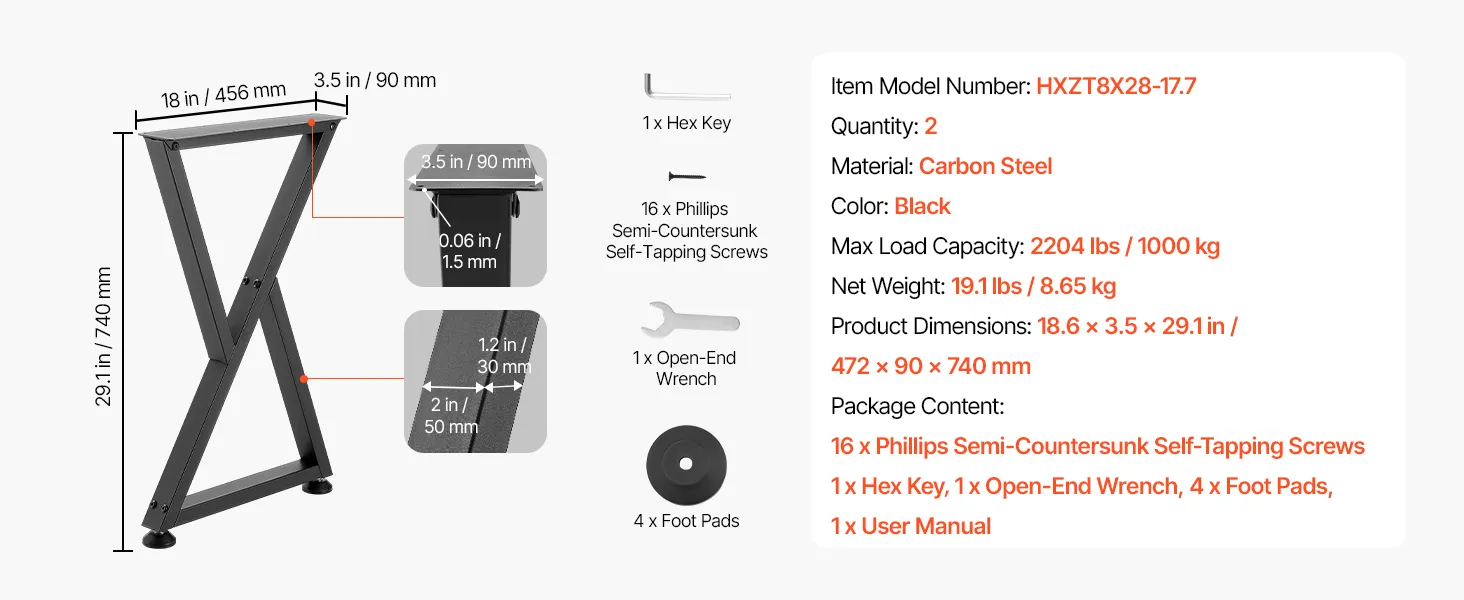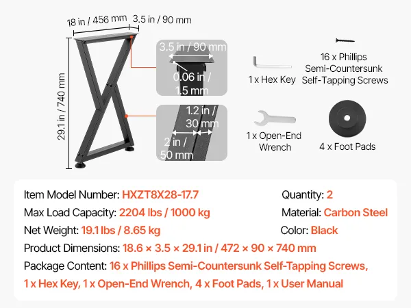 VEVOR Table Legs, 740 x 472 mm (H x W) Steel Furniture Legs, Modular Design, Easy Assembly, 1000 kg Max Load Heavy Duty, Z Shape for Home Office Desk DIY, Coffee Dinner Tables, Workbench,2 PCS, Black