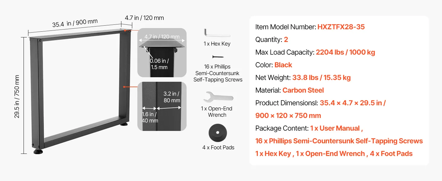VEVOR Table Legs, 750 x 900 mm (H x W) Square Steel Furniture Legs, Modular Design, Easy Assembly, 1000 kg Max Load Heavy Duty, for Home Office Desk, Workbenches, Dinner Bar Tables, Set of 2, Black
