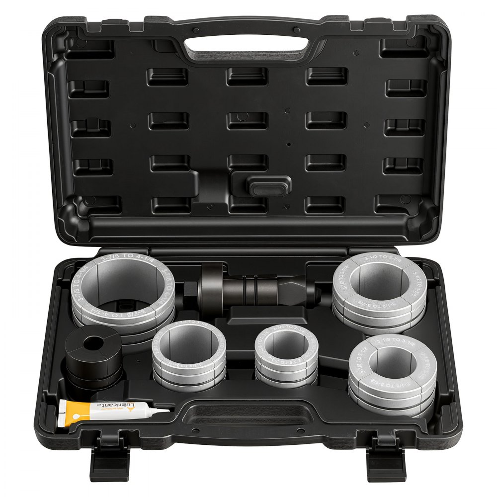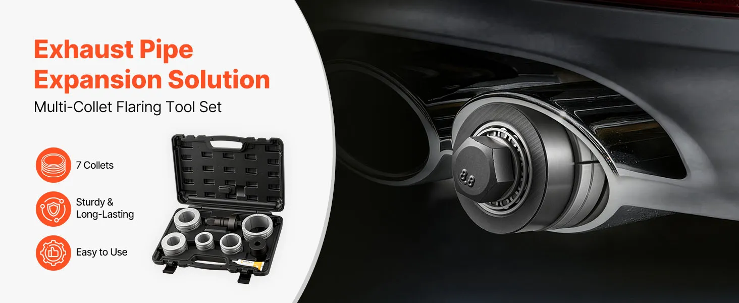 This exhaust pipe expander tool kit includes 7 collets that covers exhaust pipe sizes from 41.27mm to 107.95mm (1-5/8" to 4-1/4"), allowing efficient, precise pipe expansion for smooth exhaust flow.