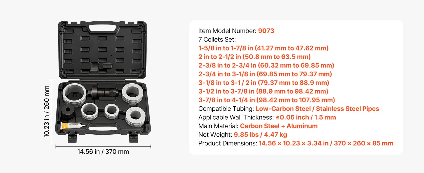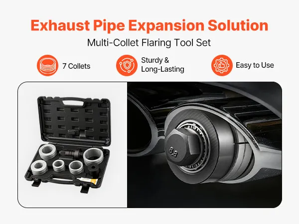 Wide Expansion Range: This exhaust pipe expander tool kit includes 7 collets to accommodate 41.27mm to 107.95mm (1-5/8" to 4-1/4") exhaust pipes, suitable for low-carbon steel and stainless steel pipes with a wall thickness of up to 1.5mm