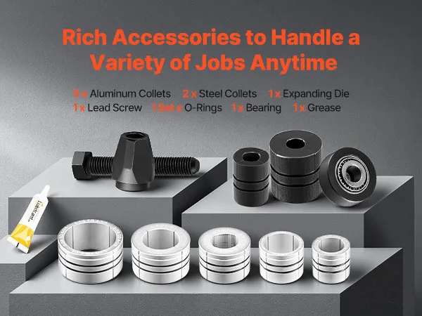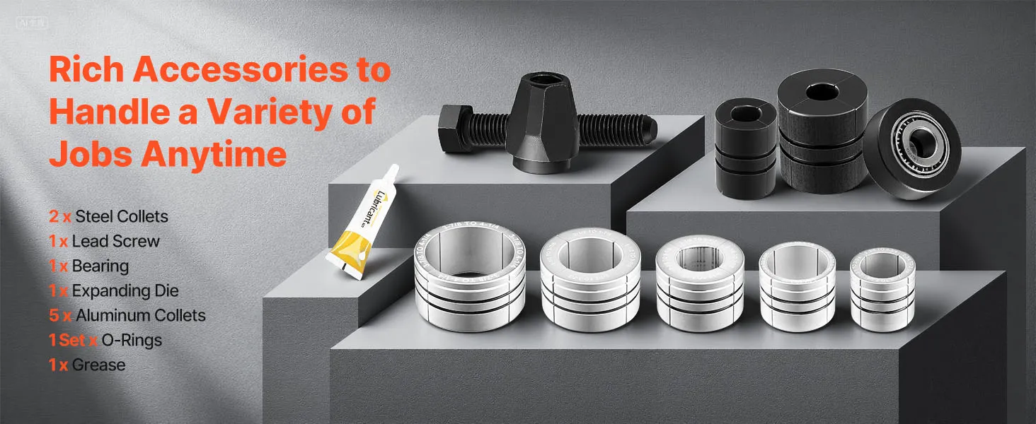 Includes 2 carbon steel collets and 5 aluminum collets for accurate sizing. The expander tool ensures smooth expansion, with lubricant and rubber rings included to reduce wear and prevent loosening.