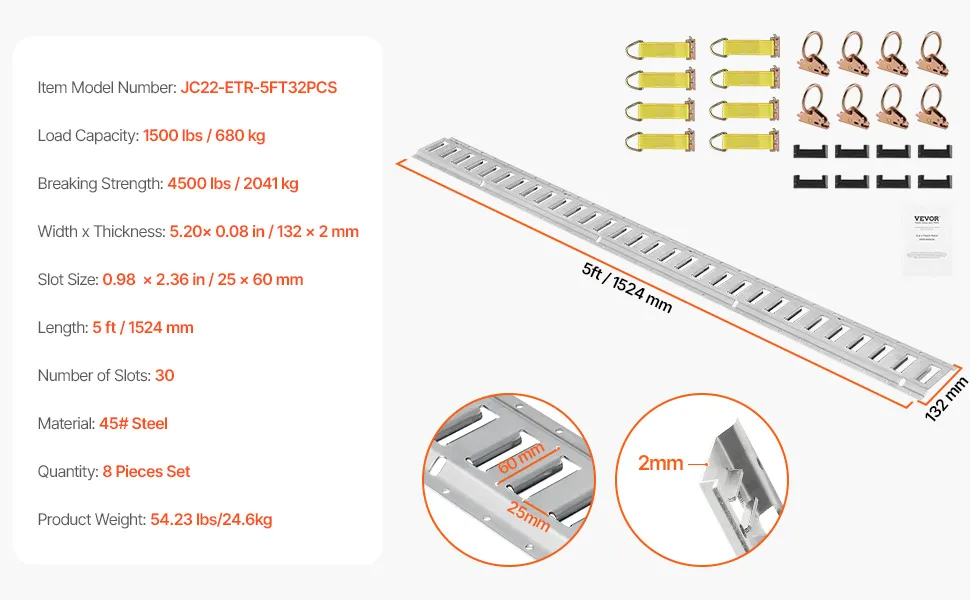 VEVOR E Track Tie-Down Rail Kit, 32PCS 1524 mm E-Tracks Set Includes 8 Steel Rails & 8 O-Rings & 8 Tie-Offs with D-Ring & 8 End Caps, Trailer Securing Accessories for Cargo Motorcycles Bikes, 680 kg