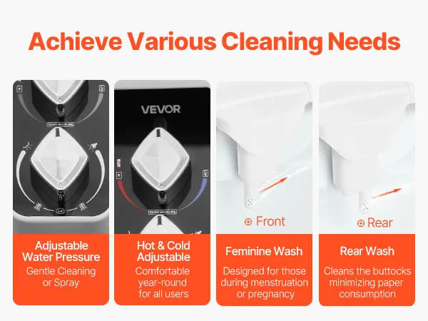 Adjustable Temp & Pressure: This toilet seat bidet attachment lets you control water temperature and pressure with dual knobs. Enjoy a warm or cool rinse that suits all users. Connect to hot water supply; no built-in heating.