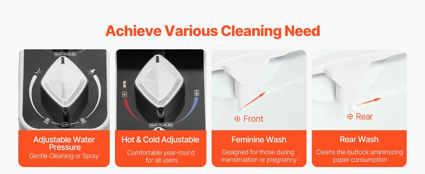 Dual Cleaning Modes: This dual nozzle bidet attachment offers separate feminine and rear wash functions, designed to meet different cleaning needs, especially gentle care for pregnant users and those during their period.