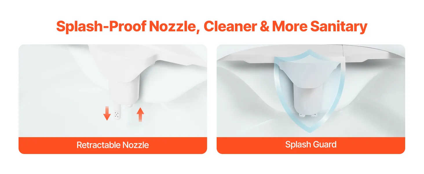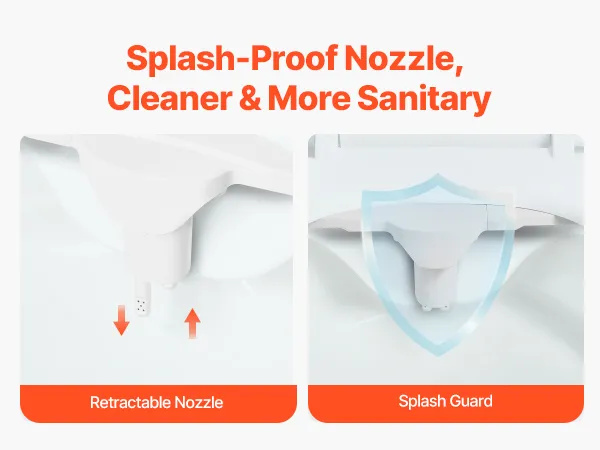 Retractable Nozzles: This toilet bidet attachment features a retractable nozzle that hides behind a splash guard when not in use, keeping it clean and protected for a cleaner wash every time.