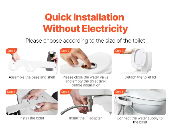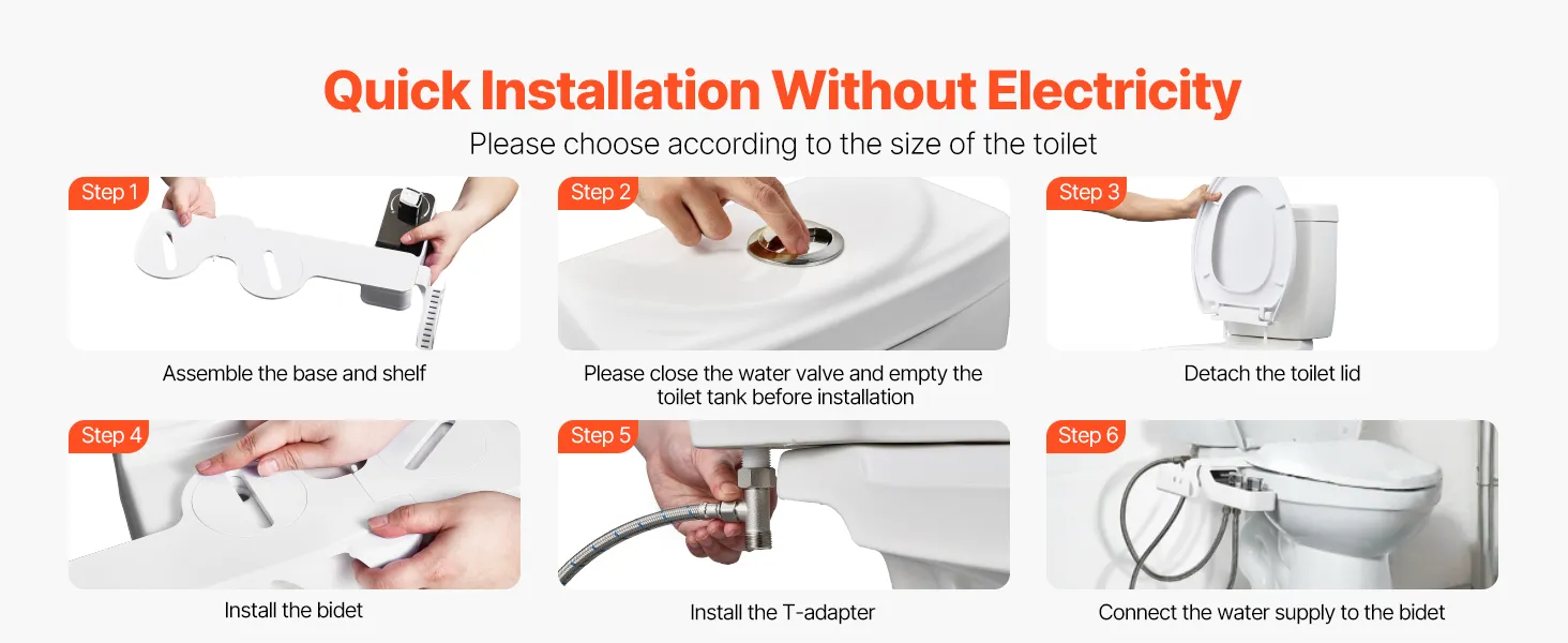This toilet seat bidet attachment installs easily—no electricity, no special tools, no plumber required. Just measure your toilet before purchase. Tip: Avoid overtightening seat bolts to keep the bidet level.