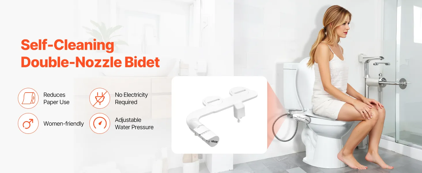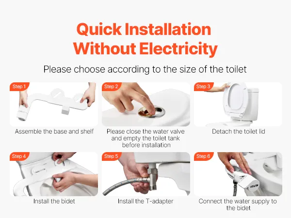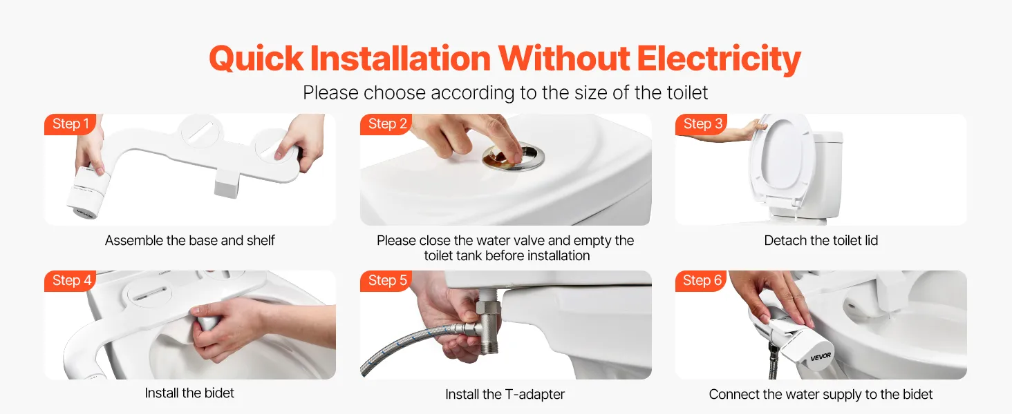 This toilet seat bidet attachment installs easily—no electricity, no special tools, no plumber required. Just measure your toilet before purchase. Tip: Avoid overtightening seat bolts to keep the bidet level.