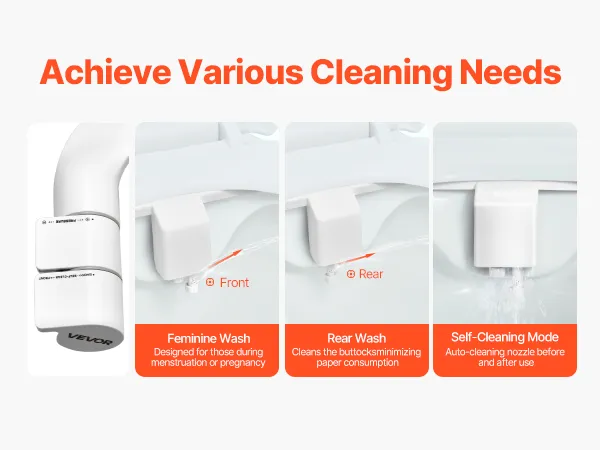 Dual Cleaning Modes: This dual nozzle bidet attachment offers separate feminine and rear wash functions, designed to meet different cleaning needs, especially gentle care for pregnant users and those during their period.