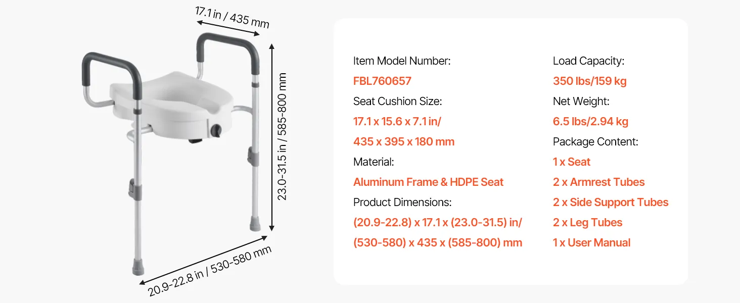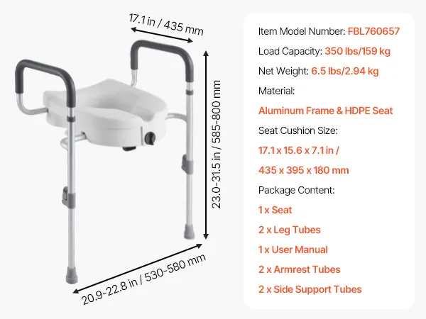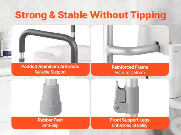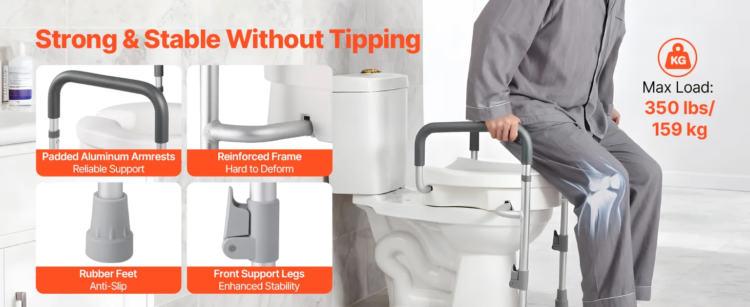 Sturdy & Secure: Our handicap toilet seat supports up to 350 lbs (159 kg) with a corrosion-resistant aluminum frame. It features two front adjustable legs to avoid tipping, padded armrests for a comfortable grip, and non-slip feet for added security