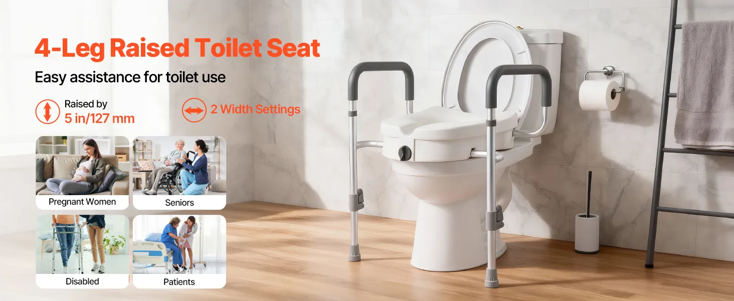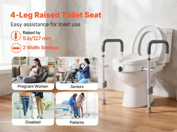 Our raised toilet seat increases toilet height by 5 in ( 127 mm) and provides two width adjustment options. Ideal for pregnant women, seniors, patients, and the disabled, it enhances comfort while reducing joint strain during use.