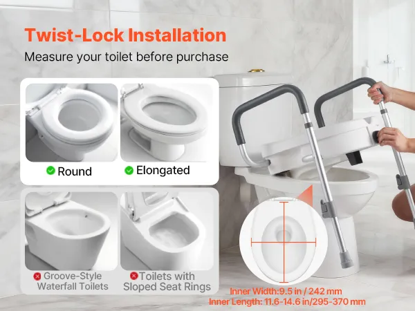 This toilet seat riser installs securely with a twist-lock mechanism. Before purchasing, check your toilet's shape and size to ensure a proper fit—refer to the images for compatible types.