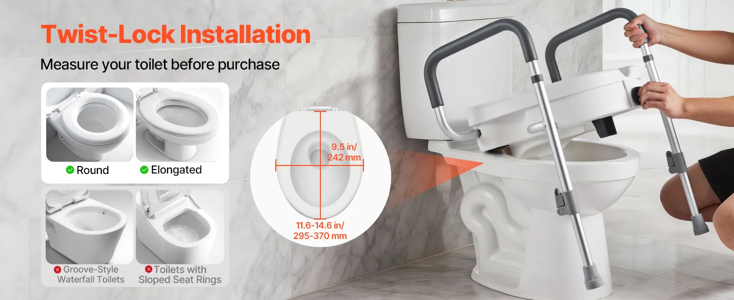 Locking Installation: This toilet seat riser installs over the toilet without drilling or tools. Simply turn the knobs on both sides to lock it in place within seconds. It fits with most standard round and elongated toilets for a confident purchase