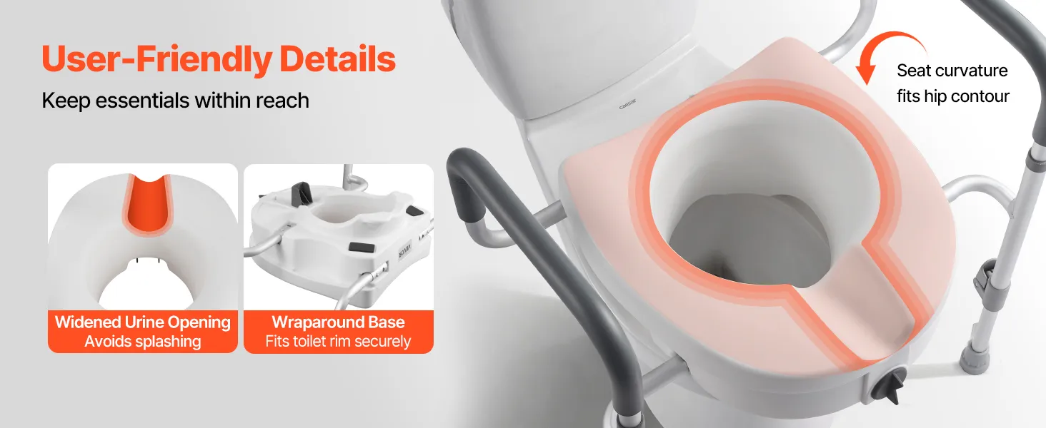 The elevated toilet seat adopts a smooth, curved design for a comfortable sitting experience, while the widened urine opening helps avoid splashes. A wraparound base adds extra stability, ensuring secure and confident use.