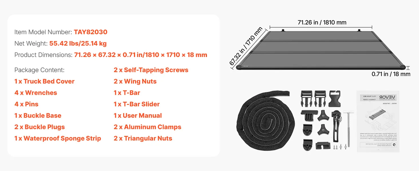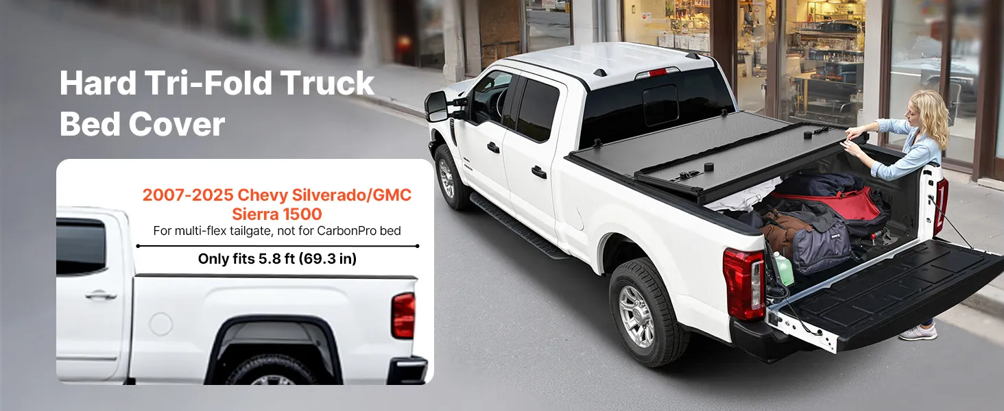 Vehicle Compatibility: This hard tri-fold truck bed tonneau cover fits 2007-2025 Chevy Silverado & GMC Sierra 1500 5.8 ft (69.3 in) Short Box (for multi-flex tailgate, no CarbonPro bed). Note: Please measure your truck bed size before purchase to ensure fit