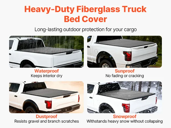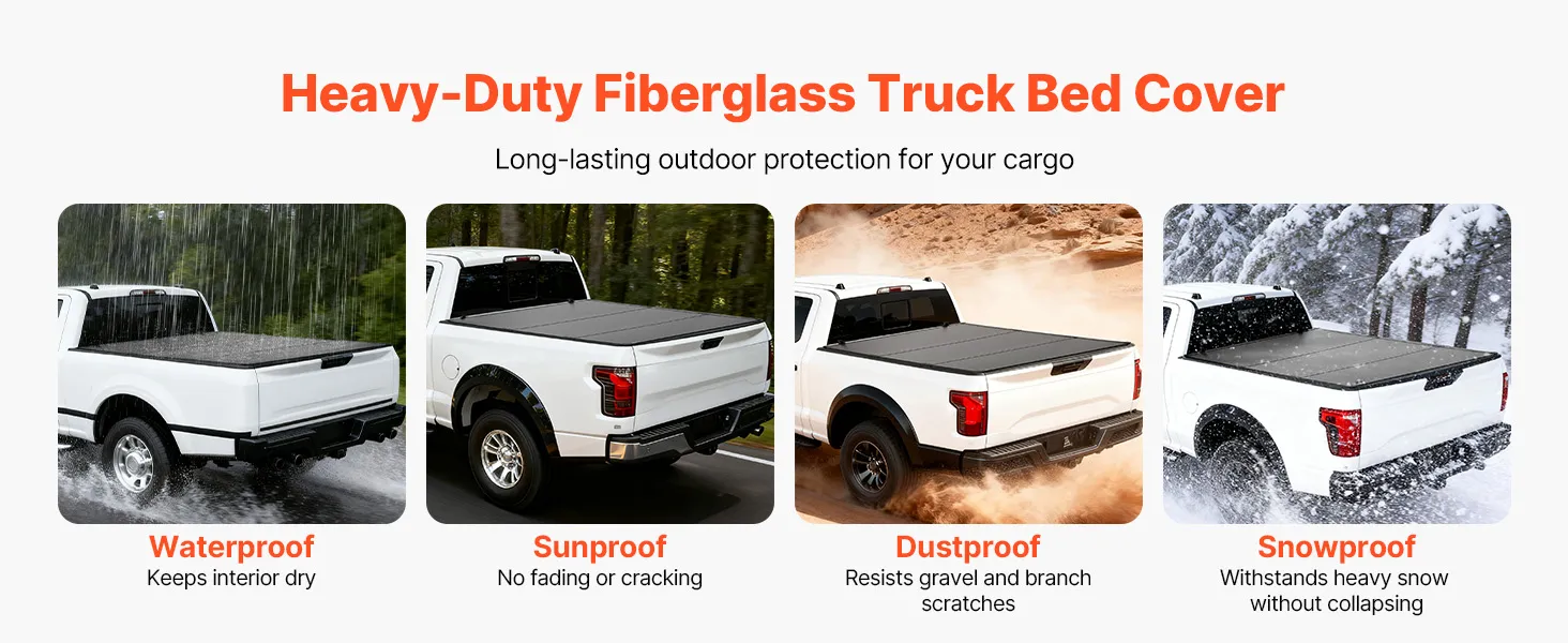 Waterproof, Sunproof & Cold-Resistant: This upgraded fiberglass fold tonneau cover with high-strength PP support resists scratches and impacts. It fully seals to block rain and snow, withstands harsh sun, and shields your cargo from gravel and branches