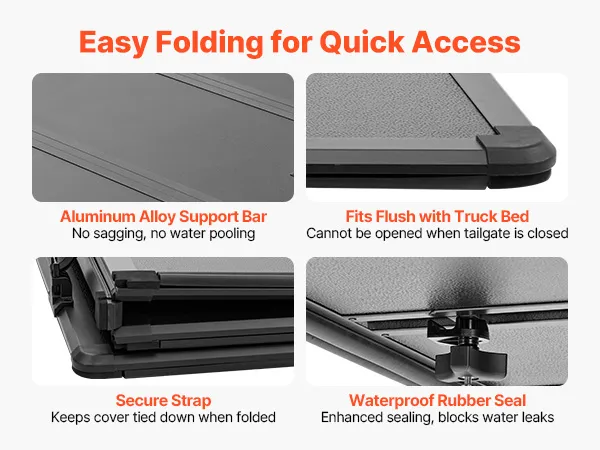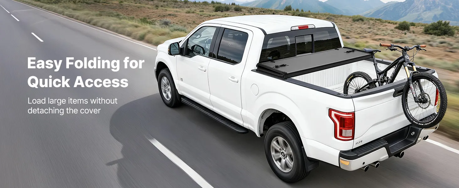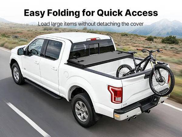 Tri-Fold Design: This truck tonneau cover folds for quick access. Partial folding lets you load large items without detaching the cover. Rear locking clamps release only with the tailgate open, adding anti-theft protection and avoiding accidental opening