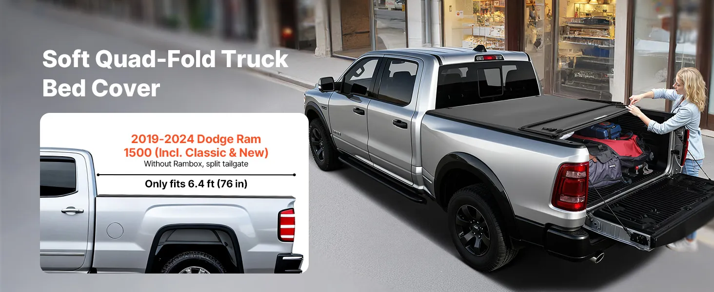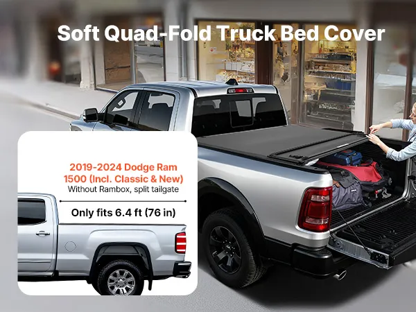Vehicle Compatibility: This soft quad-fold truck bed tonneau cover fits 2002-2025 Dodge Ram 1500 (incl. 2019-2024 Classic & 2019-2025 New Body Style), 2003-2024 Dodge Ram 2500 3500, Fleetside 6.4 ft (76 in) bed without Rambox, split tailgate