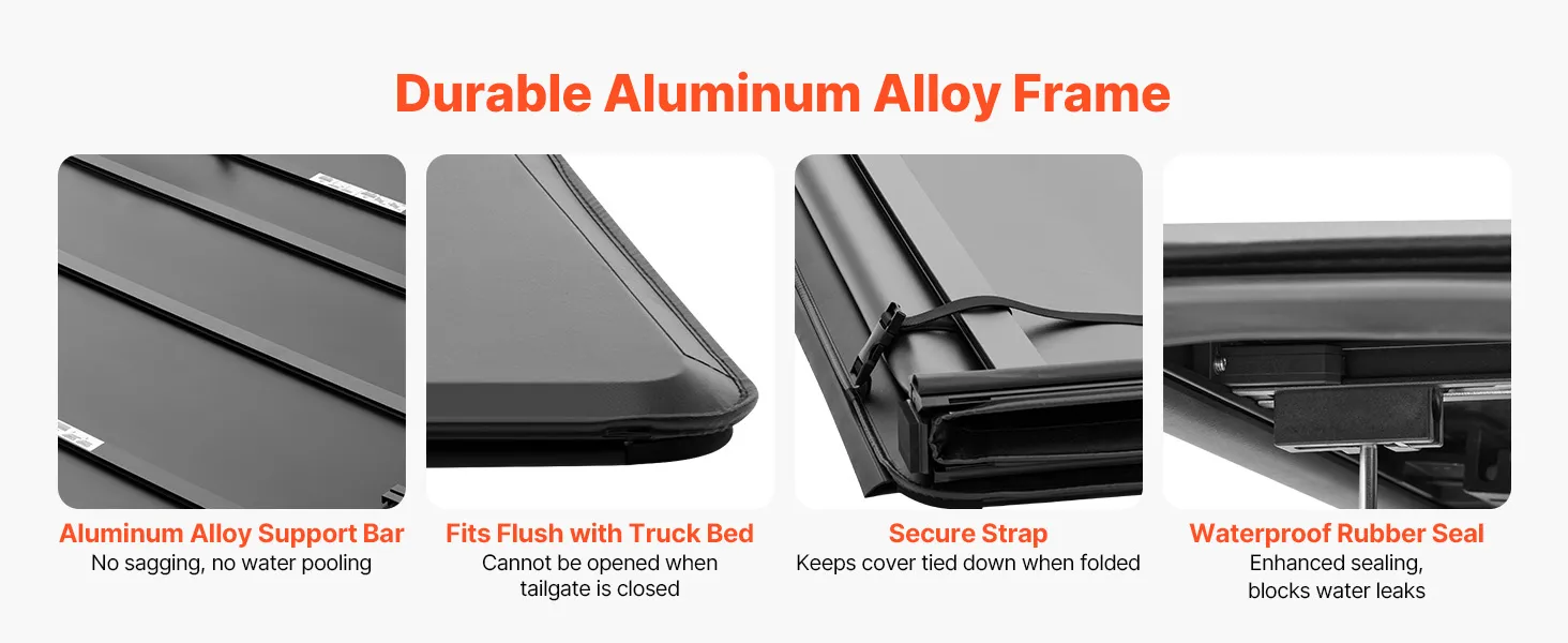 The tonneau cover features a durable aluminum alloy frame that resists sagging and water pooling. Waterproof rubber strips enhance sealing to stop leaks, while secure straps keep the cover tightly bound when folded.