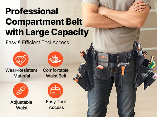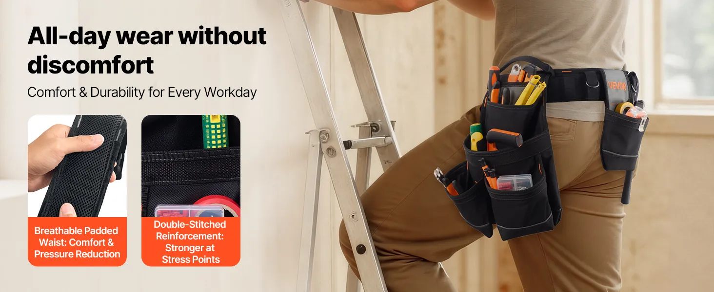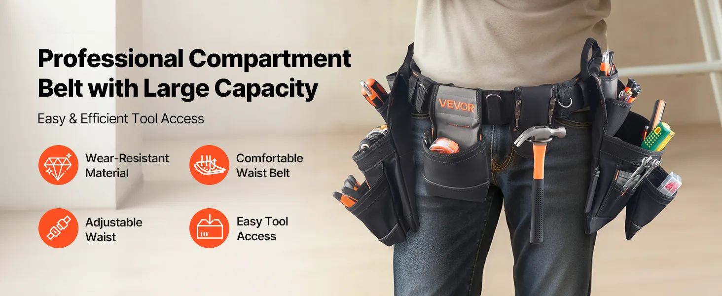 18-Pocket Storage: Our tool belt has 18 pockets to organize hammers, screwdrivers, pliers, tape measures, and nails. Quickly find tools, saving time and boosting efficiency—ideal for carpentry, electrical work, and construction sites
