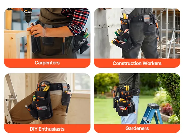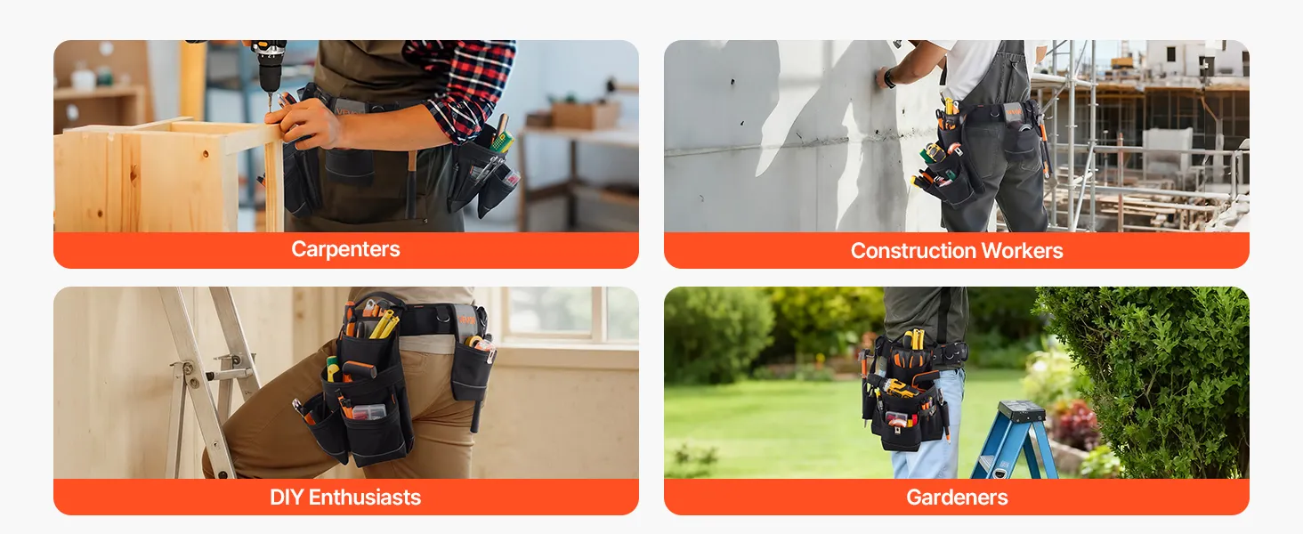 Equipped with multiple, various pockets, this tool belt holds pliers, screwdrivers, tape measures, nails, and other tools. Suitable for carpentry, decoration, or daily repairs, it keeps tools within easy reach and boosts work efficiency.
