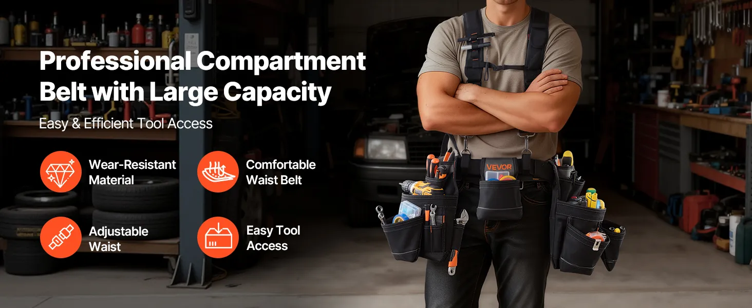 19-Pocket Storage: Our tool belt has 19 pockets to organize hammers, screwdrivers, pliers, tape measures, and nails. Quickly find tools, saving time and boosting efficiency—ideal for carpentry, electrical work, and construction sites