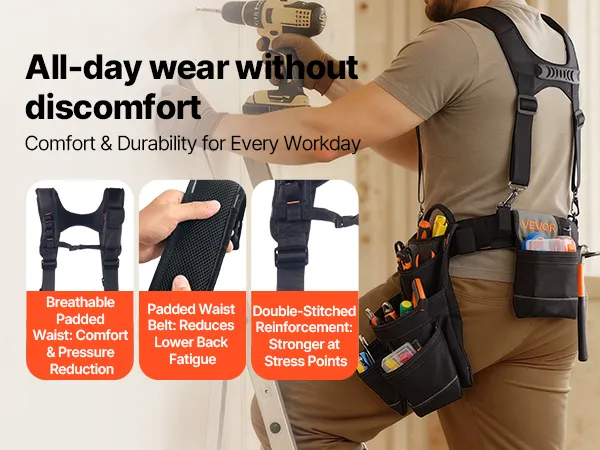 Ergonomic Comfort Waist: Our wide, padded framing tool belt evenly distributes weight and reduces strain. It remains secure and comfortable during long, intense work, avoiding constriction and fatigue, helping workers focus and boosting efficiency