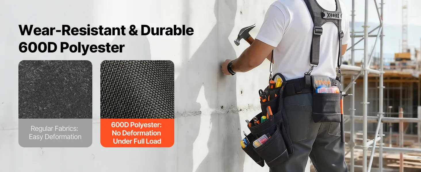 Abrasion & Tear-Resistant: Featuring 600D reinforced polyester with double-stitched seams and bound edges, our framers tool belt resists wear, tearing, sagging, and curling even under heavy tools, a full load, or in construction. Built for pros and DIYers