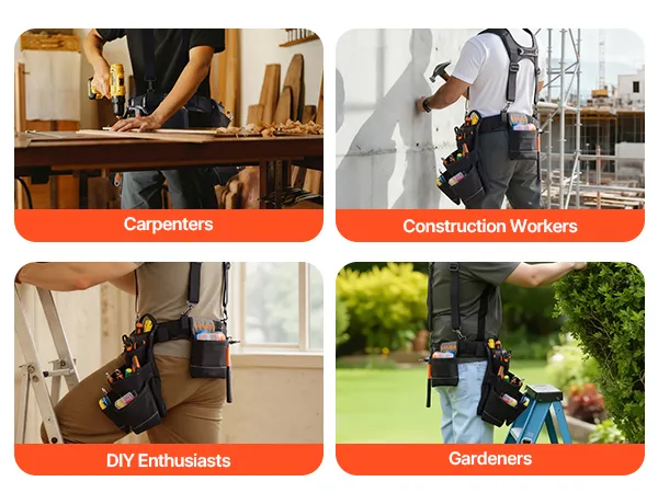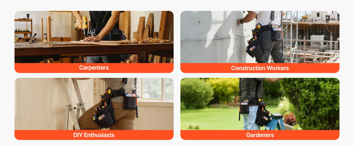 Ideal for professional craftsmen, construction workers, or DIY enthusiasts. This construction tool belt is suitable for home decoration, gardening, electrical repairs, and woodworking, making tool access efficient and convenient.