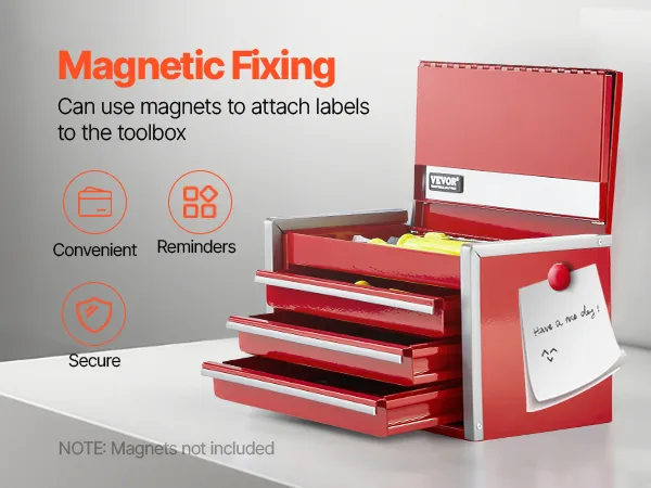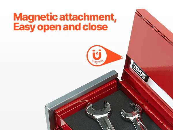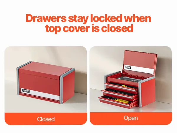 The steel tool box is designed with a magnetic top cover for easy opening and closing. When closed, the drawers stay securely in place, making it easy to move the toolbox to different locations.