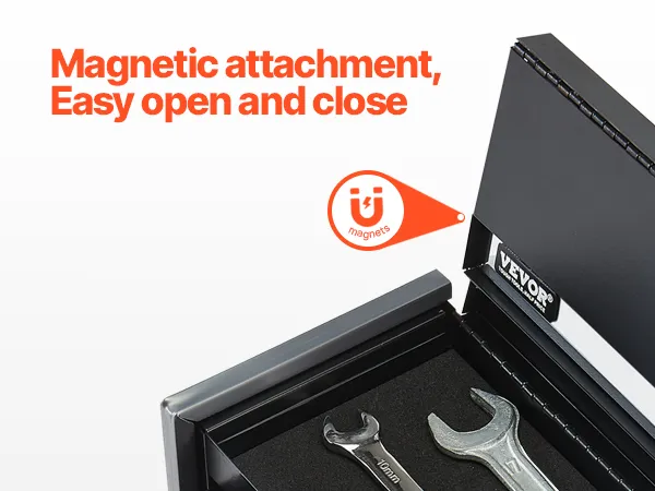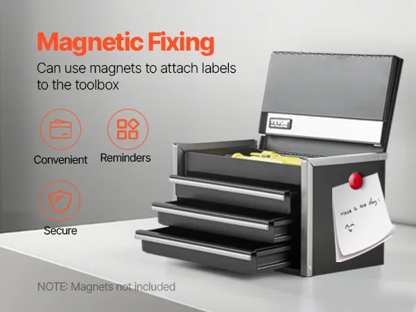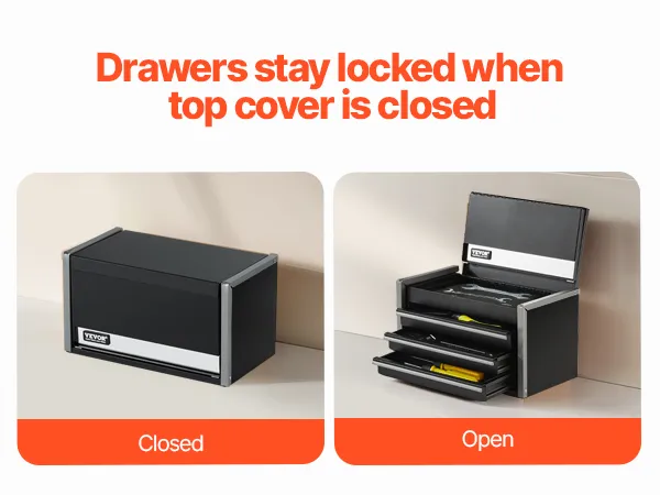 The steel tool box is designed with a magnetic top cover for easy opening and closing. When closed, the drawers stay securely in place, making it easy to move the toolbox to different locations.