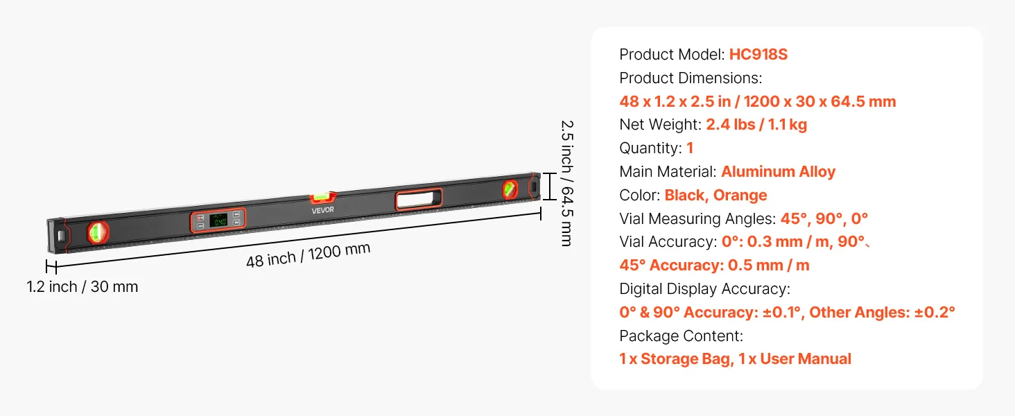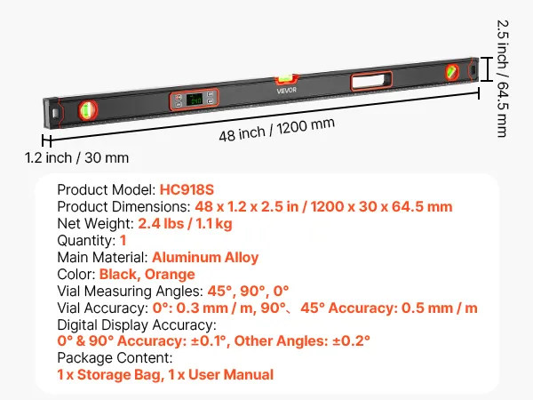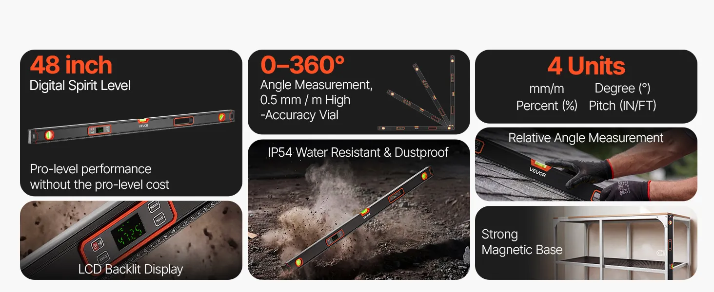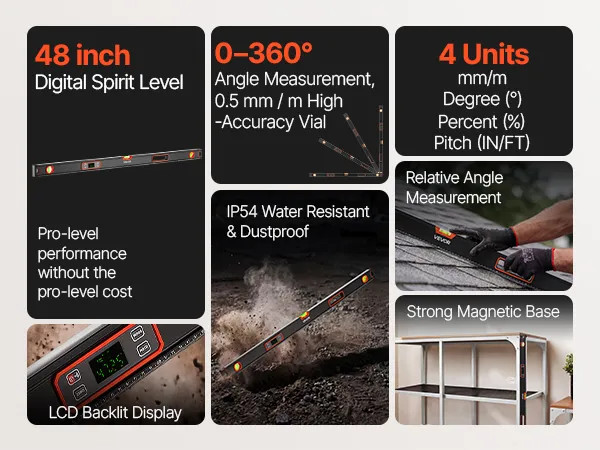 VEVOR Digital Level, 1200 mm, Magnetic Electronic Level with LED Backlit Display, 360° Electronic Leveler Tool with 0°/45°/90° Bubble Vials, IP54 Rating for Construction Carpentry Home Renovation