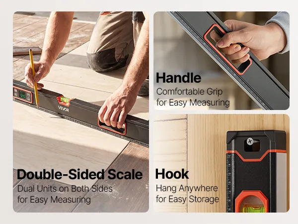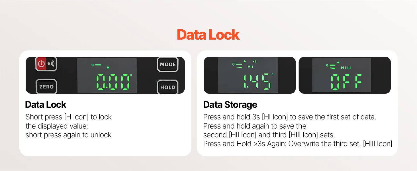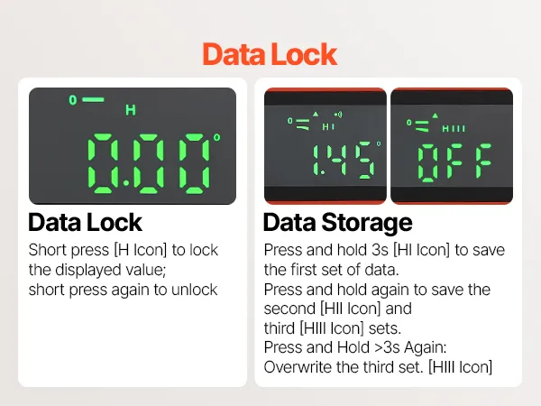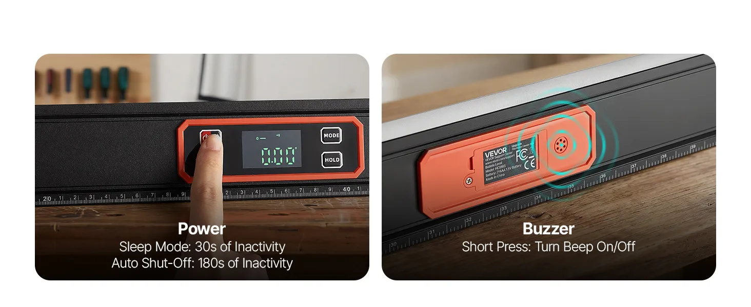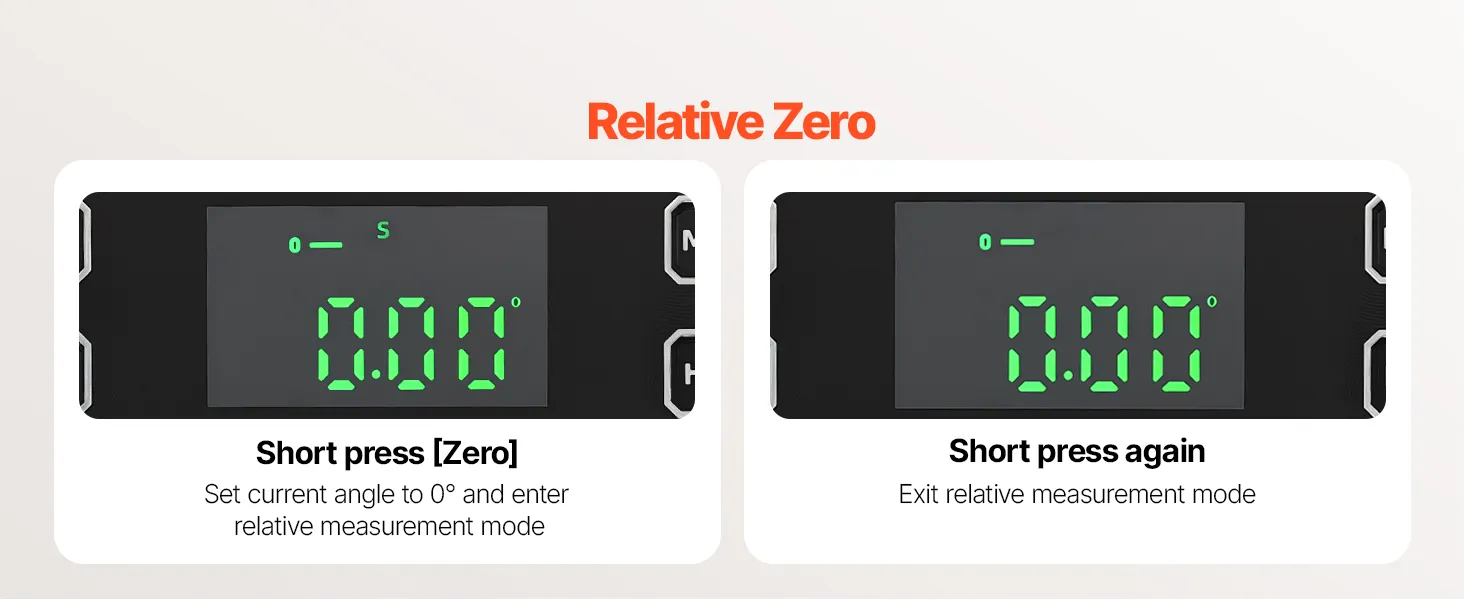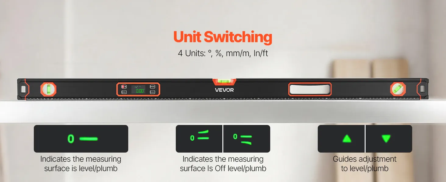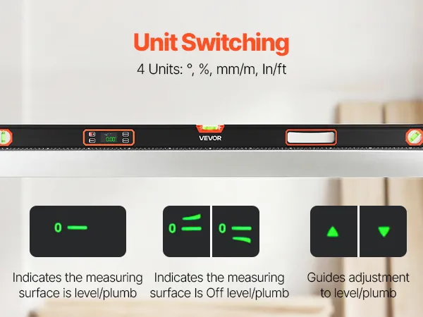 Multi-function Modes: This digital level emits a beep at 0° and 90° for quick confirmation. The display automatically flips when inverted, and four measurement units, ° , %, mm/m, and in/ft—can be switched to match your preference