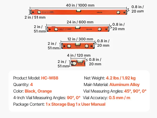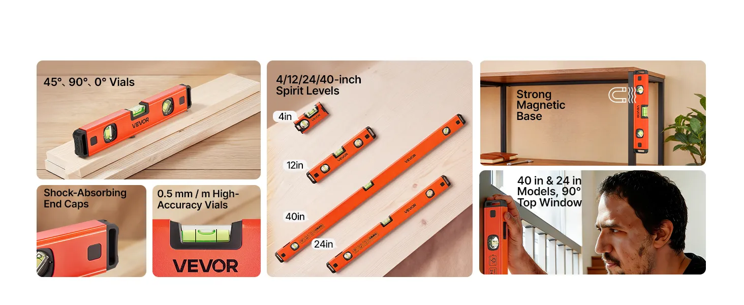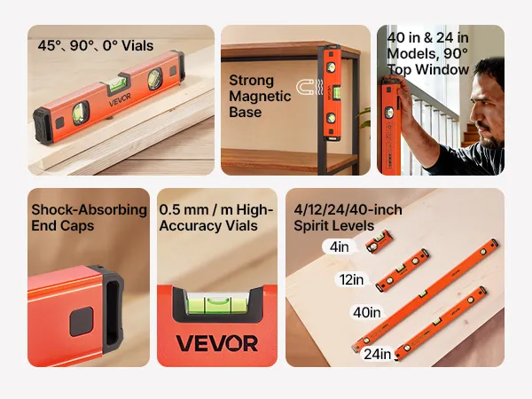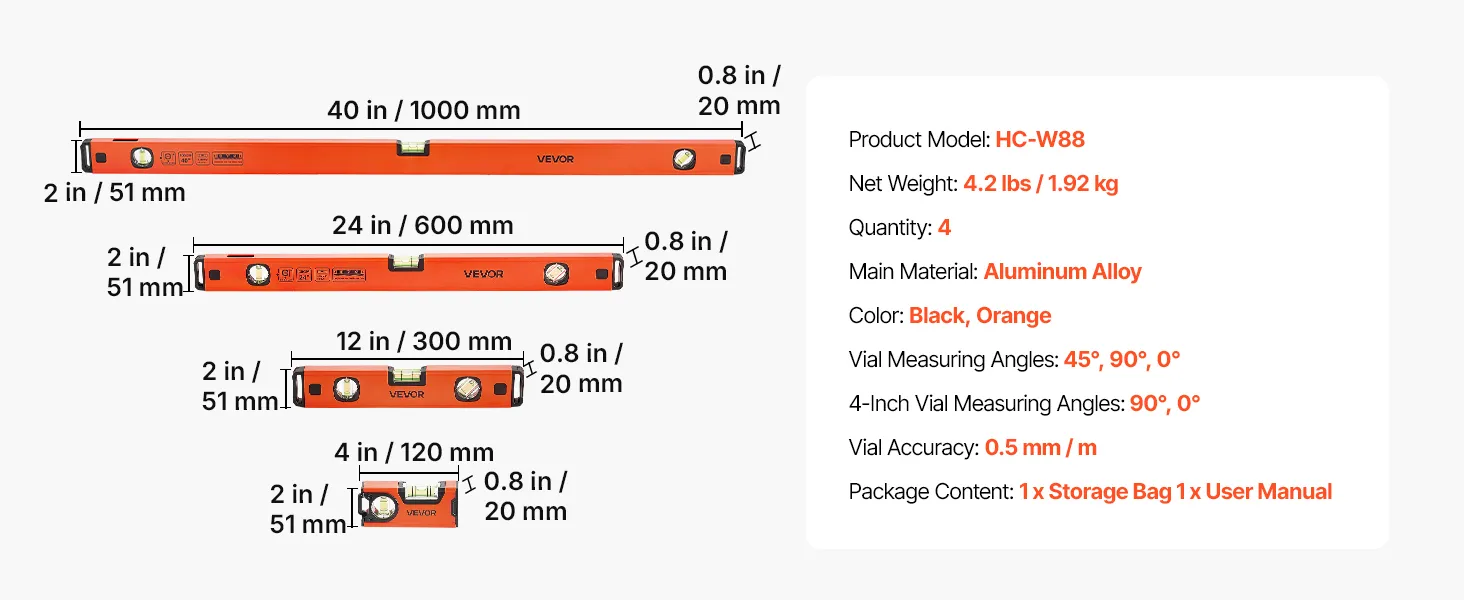 1 Set of 4 Pieces: Includes 4/12/24/40 in spirit levels, so you can choose the right length for each measuring task. From tight spaces to wide surfaces, one set covers everyday leveling needs