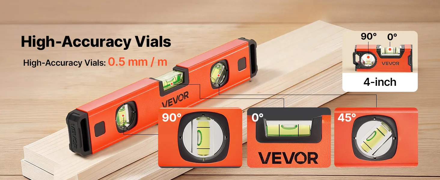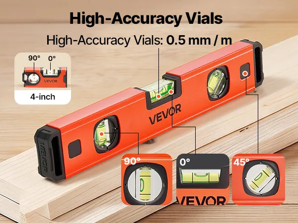 3 Vials: Each torpedo level features 3 vials for leveling at 0°, 90°, and 45°. The 4-inch model includes only the 0° and 90° vials. A hanging hole design allows easy storage and convenient hanging in different locations