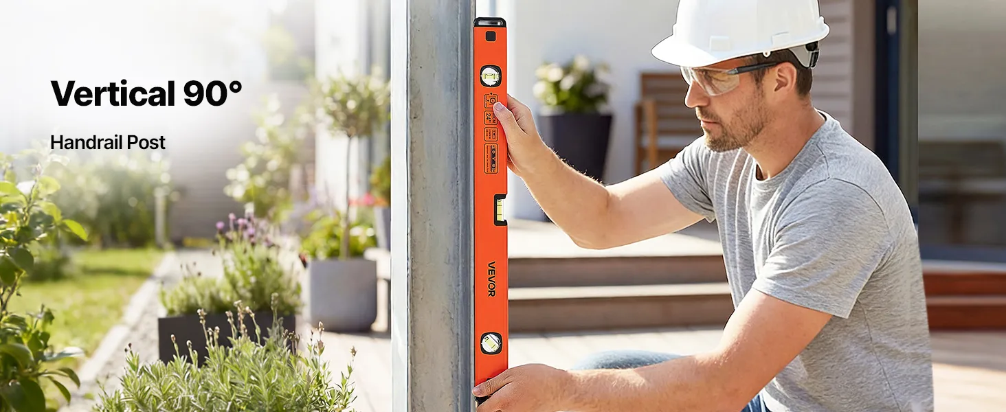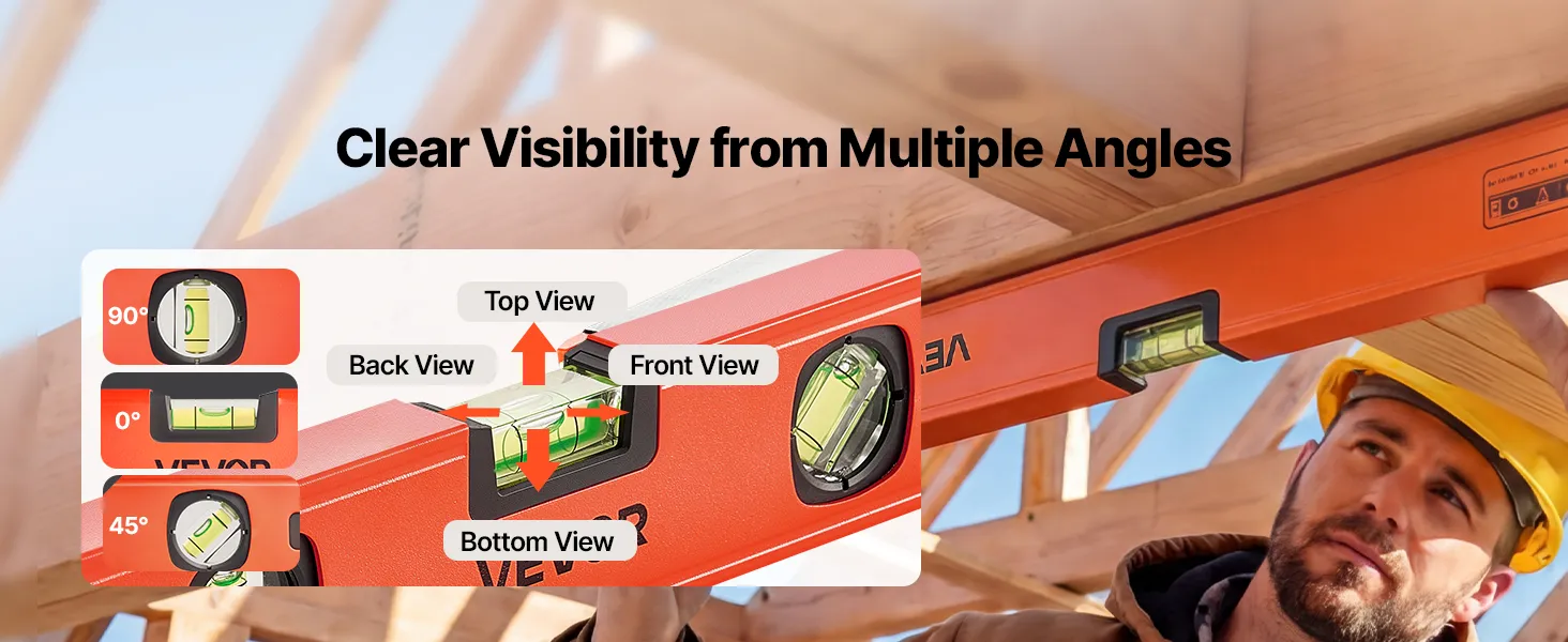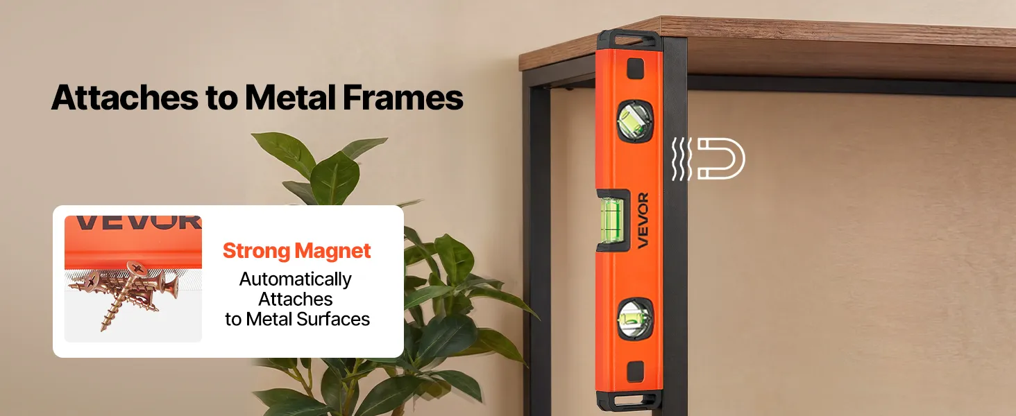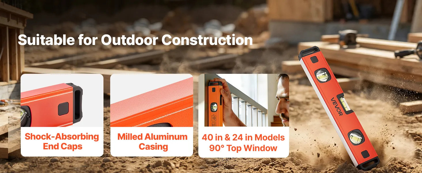 Magnetic Base: Strong magnets attach securely to metal surfaces for hands-free use. The centered handle provides balanced, comfortable one-hand operation. The 40 in and 24 in models include a top-view window for the 90° vial for easier vertical viewing