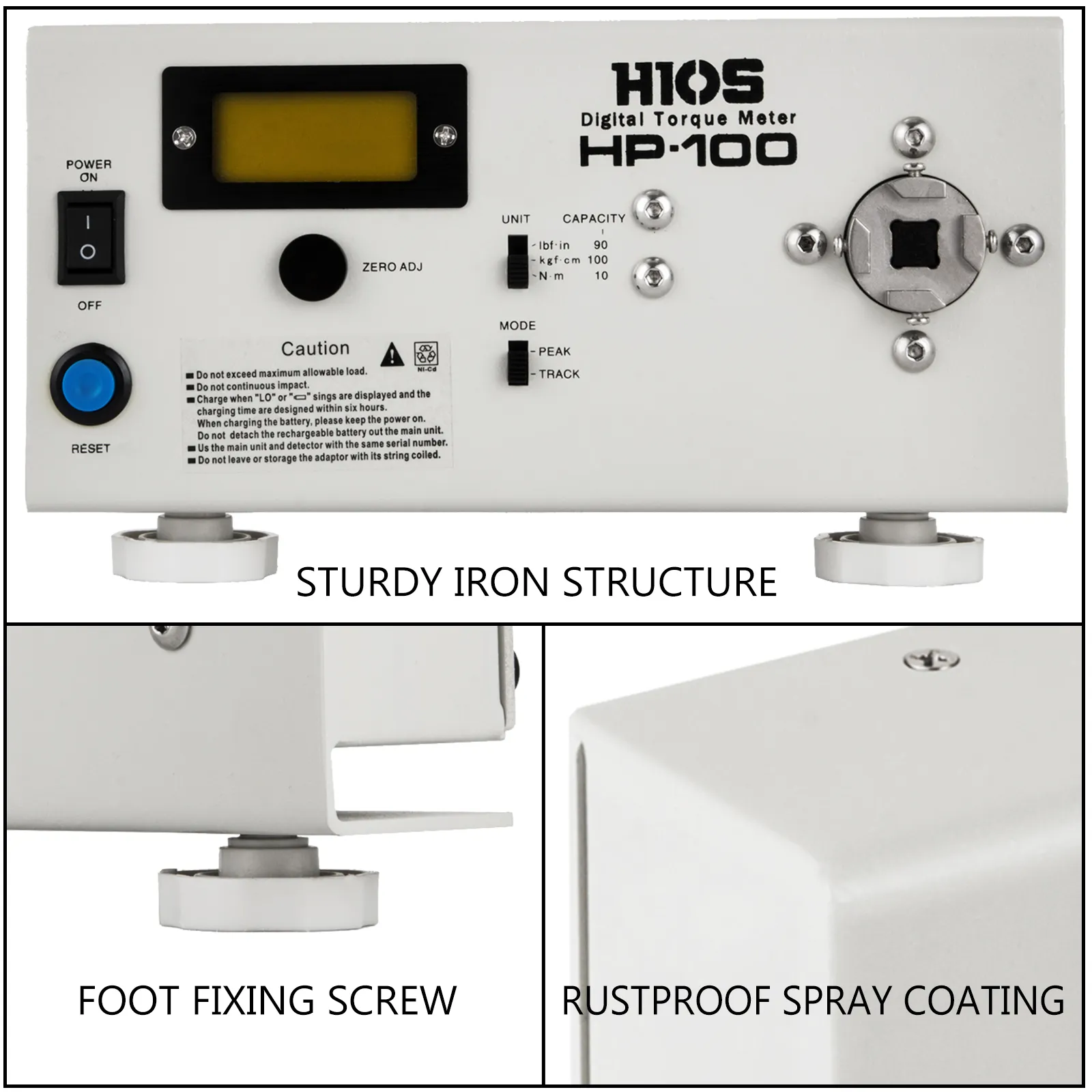 The digital torque meter is made of sturdy iron material with spray coating for rust protection, providing two fixing screws for stability on the tabletop.