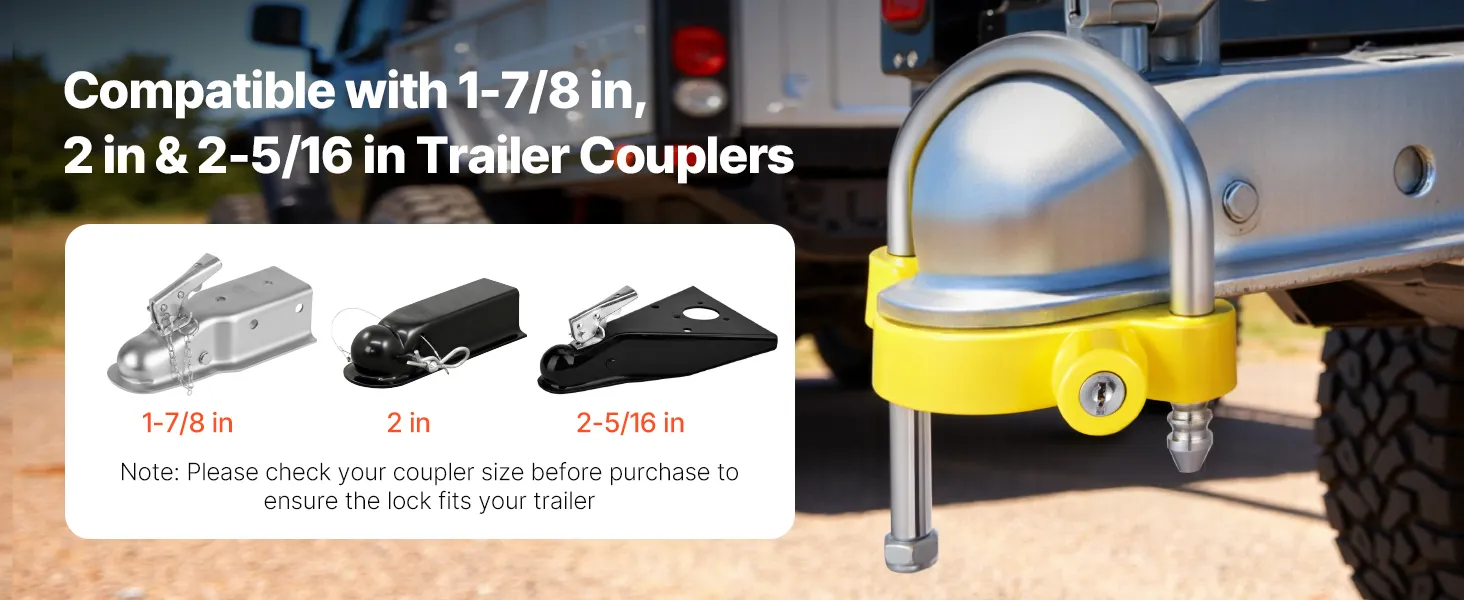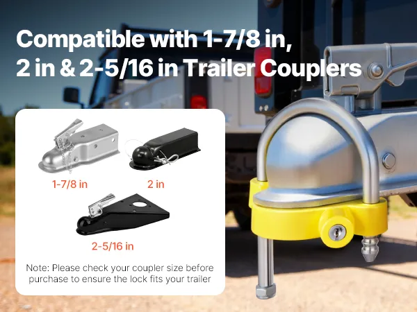 Our trailer hitch lock is compatible with 1-7/8 in, 2 in, and 2-5/16 in trailer couplers, providing wide adaptability. Please check your coupler size before purchase to ensure the lock fits your trailer.