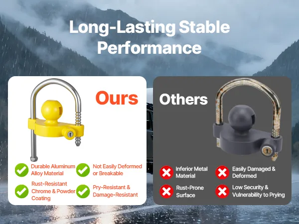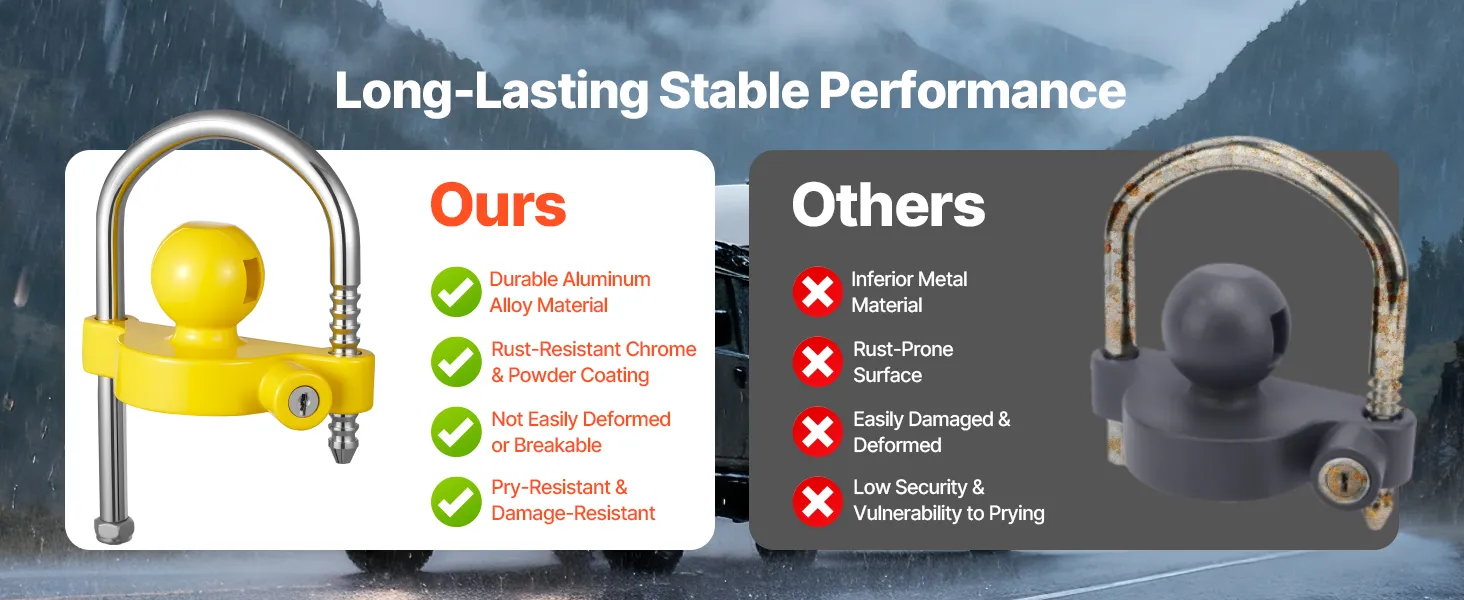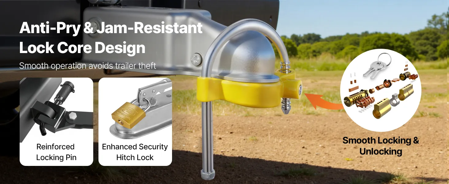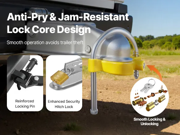 Featuring an anti-pry & jam-resistant lock core design, our trailer locks ball hitch reduces the risk of prying while ensuring smooth locking and unlocking. The precision-machined lock core combined with a jam-resistant mechanism, even when left outdoors for a long time, it won’t rust or get stuck.