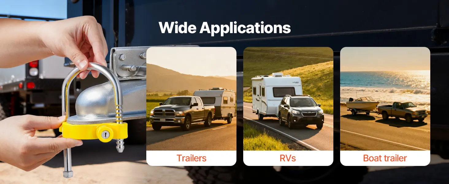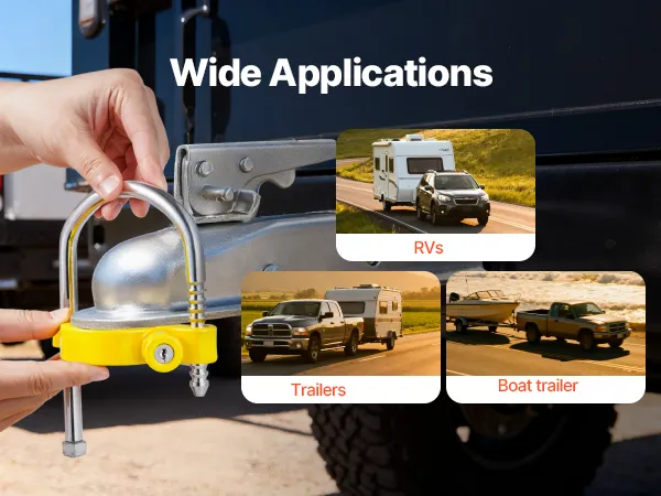Whether towing a trailer, camping with an RV, or transporting a boat, this utility trailer lock delivers dependable protection. It is suitable for trailers, RVs, off-road vehicles, and boats, giving you peace of mind in every scenario.