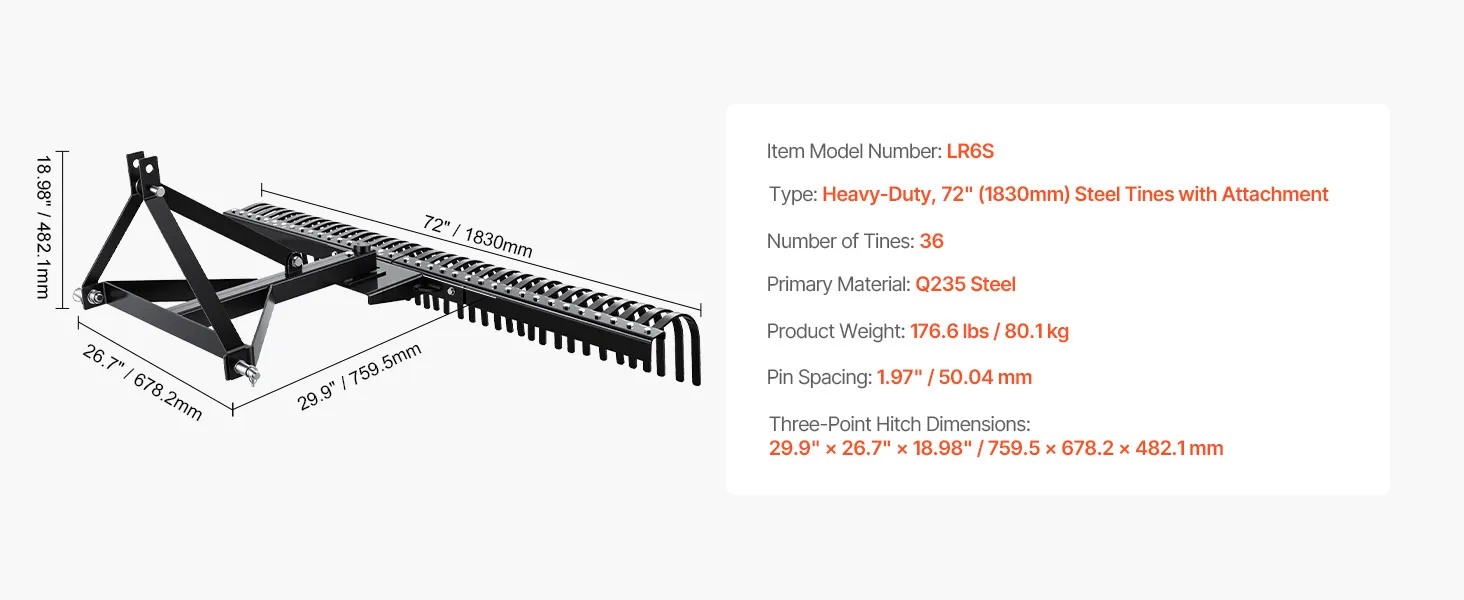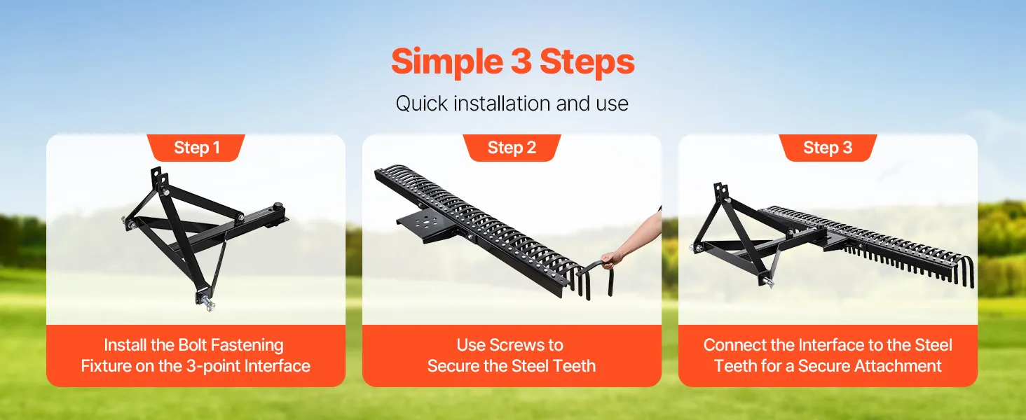 Durable Structure: Made from 0.3'' thickened steel tines with heat treatment, our lawn dethatcher is robust and durable, resisting breakage and bending. The three-point hitch is securely welded, preventing detachment. The solid construction ensures a long lifespan and damaged tines can be easily replaced.