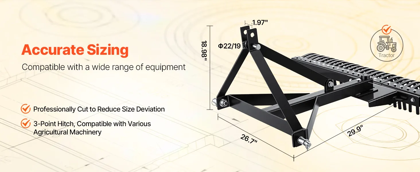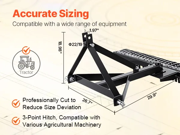 Wide Compatibility: The pin spacing of the connecting interface is 1.97", compatible with tractors equipped with Category 1, 3-point systems, such as Kubota, New Holland, Ford, and other mainstream brands. No rear hydraulic device or PTO is required.