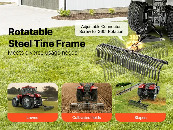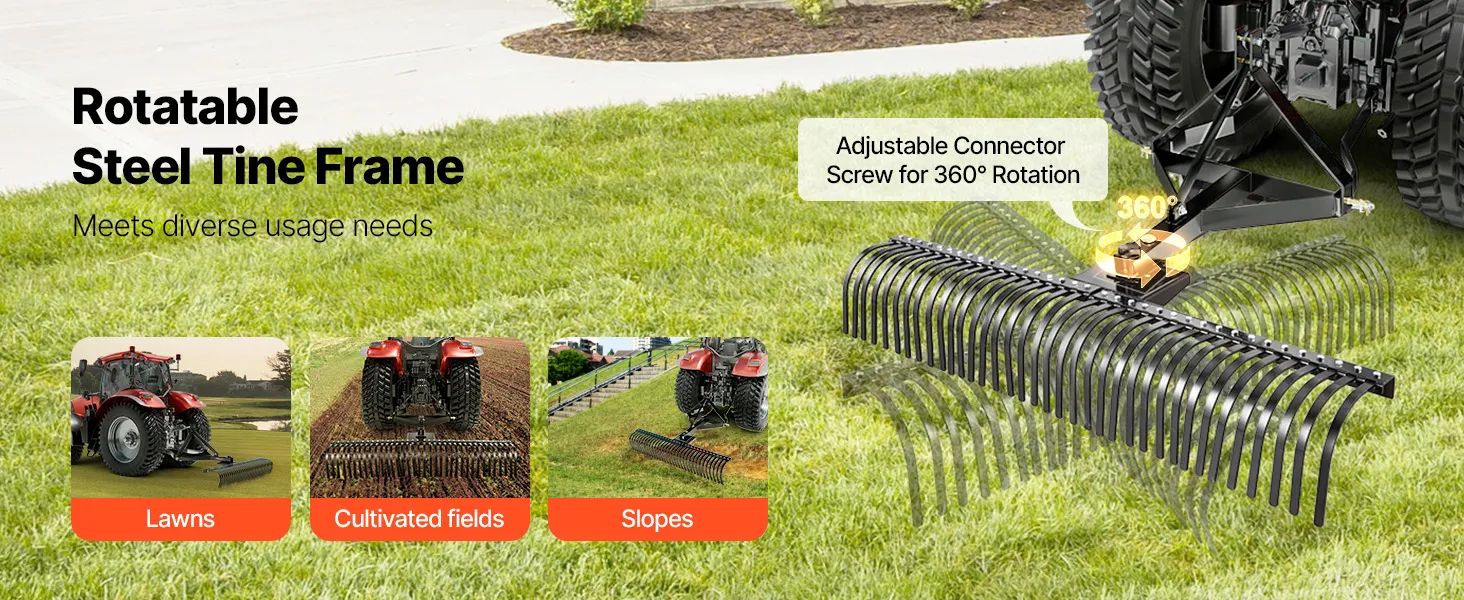 Easy to Use: The tine rack can be adjusted 360°, allowing for use at different angles, even in reverse. Whether you are working on residential projects, golf courses, or slopes, our dethatcher performs excellently in leveling and restoring land.