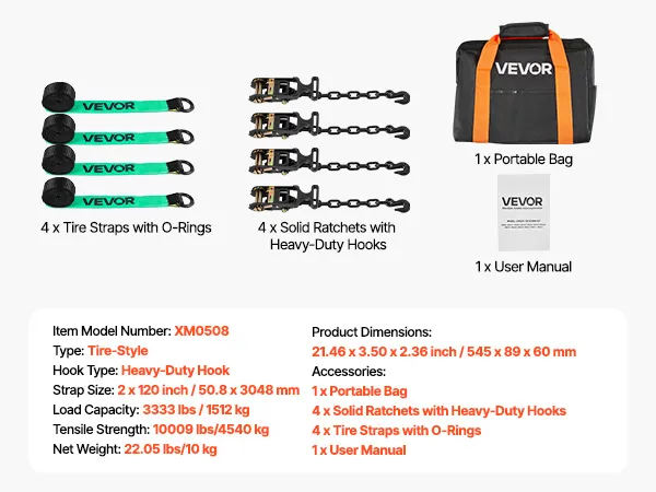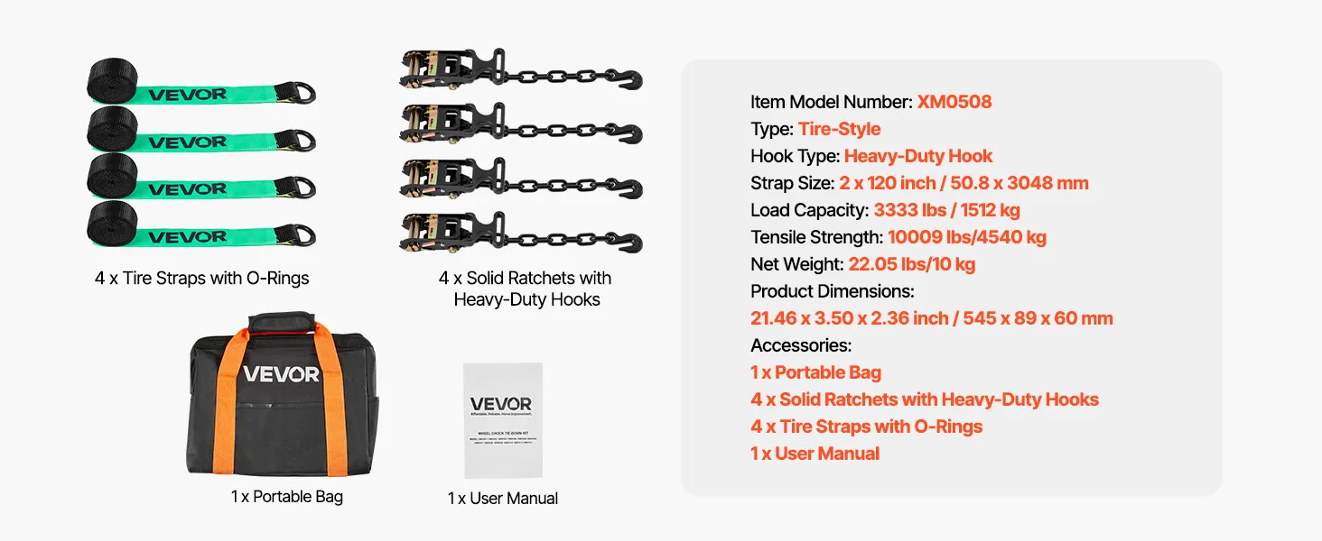 Tire-Friendly Design: Featuring soft materials and rubber blocks that directly touch the tire, our ratchet strap minimizes friction and pressure, ensuring your tires and rims remain undamaged during transport. The kit includes four sets of solid ratchets and four sets of 120-inch/3048mm webbing