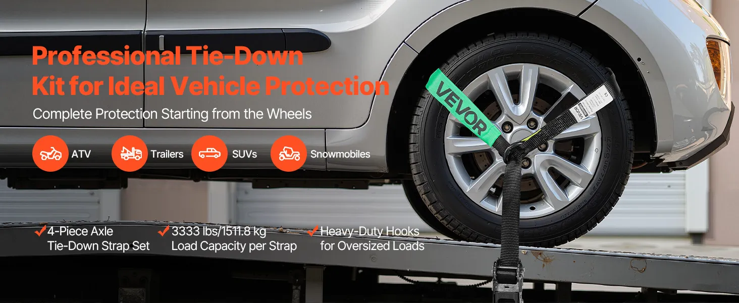 Equipped with a heavy-duty hook, our wheel tie-down kit provides reliable load support for heavy vehicle transport. Made from polyester, each strap supports up to 3333 lbs/1512 kg, keeping your vehicle in place while being transported or parked.