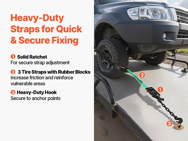 Heavy-Duty Hook: The ratchet strap features heavy-duty hooks that provide strong load-bearing and firm grip,latching onto axles and trailer anchor points. It enables quick wheel securement and release, and reduces the risk of accidental detachment